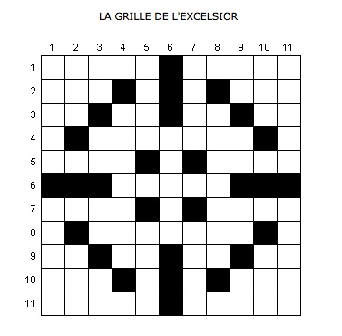 Peu après les premières publications dans le Dimanche Illustré, fin février 1925, c’est le tour de l’Excelsior qui publie la grille suivante qui garde une disposition symétrique des noires. Les définitions restent assez plates mais elles ont plus de précision : un pronom est signalé personnel, un adverbe est précisé de lieu et une note de musique. |