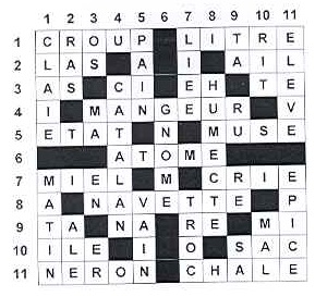 Elle a bien la forme rectangulaire et les définitions sont réparties en Horizontalement et Verticalement. Le repérage par des numéros dans les cases des têtes de mot est de style anglais. Le pourtour est libre de cases noires. Les noires sont nombreuses et sont disposées en une mosaïque qui diminue les croisements. Les définitions sont laconiques. L’ensemble n’est pas encore très fiable mais cela est dû au manque de rodage..Le 8 horizontal est un substantif (AMI) alors que la définition appelle un adjectif (FAVORABLE). Le 12 horizontal (préposition) a comme réponse une conjonction (ET). Le 17 vertical (Vêtement) ne croisant que sur deux de ses lettres a deux solutions (FRAC ou FROC) possibles. Cela étant, cette grille présente un intérêt historique certain. Horizontalement 1. Champêtre. 8. Favorable. 9. Chiffre. 10. Note. 11. Arme. 12. Préposition. 15. Fleur. 16. L’égal de quelqu’un 18. Pronom. 20. Appel. 21. Note. 22. Arbre 24. Particule d’atome. 25. Vive lueur. Verticalement 1. Temps de verbe. 2. Conscience intime. 3. Note. 4. Personnage légendaire. 5. Terme de jeu. 6. Dépôt de liquide. 7. Détruit. 13. Fleuve. 14. Petit animal. 17. Vêtement. 19. Meuble. 21. La terre. 23. Négation. 24. Pronom. Solution
